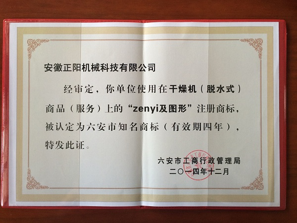 “zenyi”牌干燥機(jī)(脫水式)商標(biāo)榮獲六安市知名商標(biāo)稱號